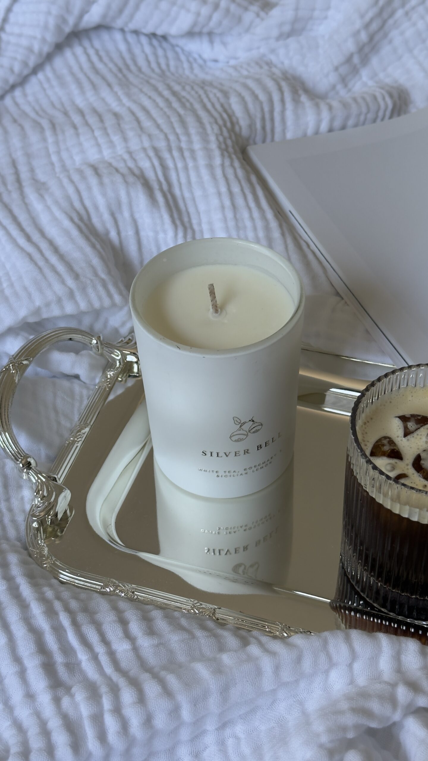 נר יוקרתי על בסיס תה לבן בתוספת רוזמרין ולימון סיציליאן אשר מרגיע ומשרה נינוחות מרענננים